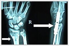 You will be given medication to lessen the pain. If necessary, your doctor are will move the ends of the broken bones back into proper alignment. If the break is very severe, you may be given general anesthesia so that the bone can be repositioned during surgery. A cast or splint may be applied to help maintain the position of the bones. To maintain the alignment an external fixator may be applied as shown below. X-Ray on the left shows fracture and the pins. The arrow in the right side X-Ray shows the rod of the external fixator. In some cases small wires are passed under anaesthesia to maintain aligmment. Wires as well as external fiaxtor needs no cutting of the skin and can be taken out without anaesthesia in the Out patient Department. A Colles’ fracture usually takes up to 8 weeks to heal. X-Rays may be taken from time to time during recovery to see how it is healing. When the cast or splint is removed, the affected wrist and the fingers, hand, and shoulder on that side may be stiff for several more weeks. Your health care provider may prescribe exercise and physical therapy. You will not be able to bend your wrist while the cast or splint is in place. You may need someone to help you with daily activities such as cooking, housework, driving, and self-care (showering and dressing) until the cast or splint is removed. Older people in poor health may need extra help to maintain an independent lifestyle while they recover from a Colles’ fracture.